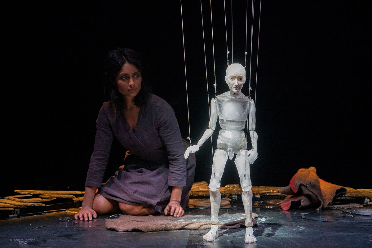 In this exquisite, landmark string-marionette work created by the French company Théâtre de l’Entrouvert, a marionnette made of ice takes center stage. Freely inspired by Henry Bauchau’s novel “Oedipus on the Road,” Anywhere evokes the long wandering of Oedipus accompanied by his daughter Antigone. The fallen Oedipus appears in the form of an ice puppet that gradually melts, then appears as mist and finally disappears in the forest, the place of clairvoyance. Anywhere traces with gentleness and strength a poetic journey, in black and white, of fire and ice, which speaks to us about our bodies, our environment, our fragilities, and our wanderings in the infinite circle of renewal.